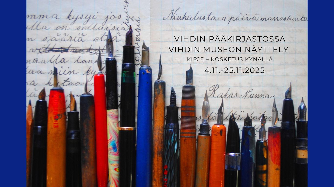 Kirje – kosketus kynällä -näyttelyssä pääsee muistelemaan menneitä vanhojen kirjoitusvälineiden, kirjeen kirjoittamisen taidon ja kaunokirjoituksen koukeroiden kautta. Saatat myös löytää näyttelystä tuttuja vihtiläisiä kasvoja ja heidän käsialojaan…