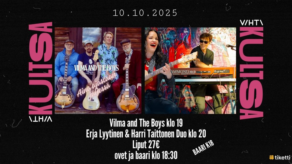 Erja Lyytinen & Harri Taittonen klo 20, ovet auki klo 18:30. Useilla tunnustuksilla palkittu kitaristi-laulaja Erja Lyytinen ja suvereeni kosketintaiteilija Harri Taittonen yhdistävät voimansa duona! Ohjelmistossa kuullaan kappaleita Lyytisen laajasta tuotannosta bluesin ja rockin parissa sekä nostalgisia lainakappaleita aina Elviksestä Extreme-yhtyeen hitteihin. Ennen upeaa Erja Lyytistä lavalle saapuu klo 19 Vilma And The Boys joka on kokeneiden muusikoiden lämminhenkinen kitaraorkesteri. Heidän ohjelmistonsa kulkee suomalaisista ikivihreistä vanhoihin jazzklassikoihin ja bluesiin tyylillä ja tunteella. Tähän keikkaan he ovat valinneet sitä ”jatsahtavampaa ohjelmistoa”. Liput vain Tiketistä, ei ovimyyntiä.