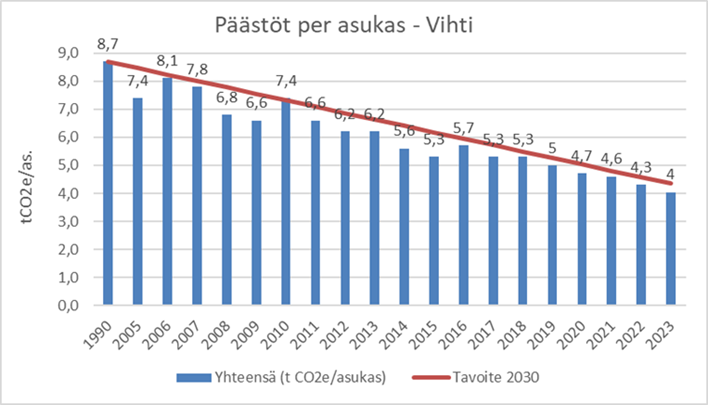 Vuoden 2030 tavoitteena oli vähentää asukaskohtaisia päästöjä 50 % vuoden 1990 (8,7 t CO₂- ekv/as.) tasosta. Tavoitetaso vuodelle 2030 oli siis 4,35 t CO₂-ekv. /asukas. Vuonna 2023 päästöt olivat 4,0 t CO₂-ekv. /asukas. Vuodesta 1990 alkaen asukaskohtaiset päästöt ovat vähentyneet 53 %. Vihti on siten saavuttanut asettamansa tavoitteen puolittaa asukaskohtaiset päästöt vuoteen 2030 mennessä. Alle olevan kuvan luvut perustuvat SYKEn käyttöperusteiseen kuntalaskentaan (SYKE – kuntien ja alueiden khk-päästöt) (Hinku-menetelmä, ilman päästöhyvityksiä). Tuoreimmat vahvistetut tiedot koskevat vuotta 2023.