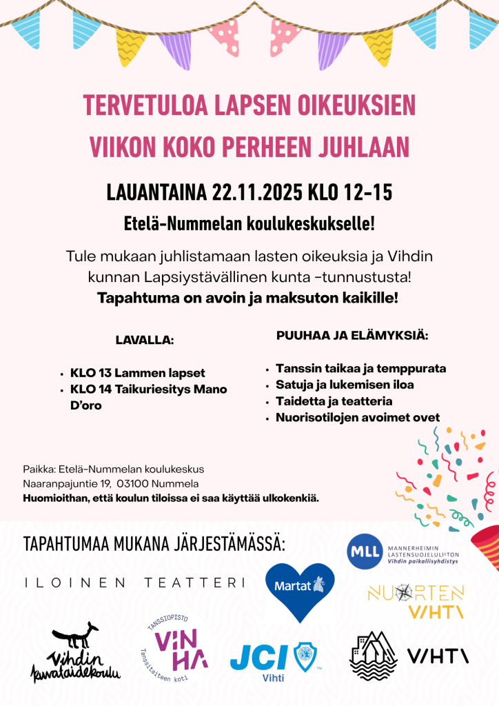 Lapsen oikeuksien viikon kunniaksi järjestetään koko perheen juhla lauantaina 22.11.2025 klo 12–15 ja nuorisolle klo 16.30–18 Etelä-Nummelan koulukeskuksella (Naaranpajuntie 19, Nummela).