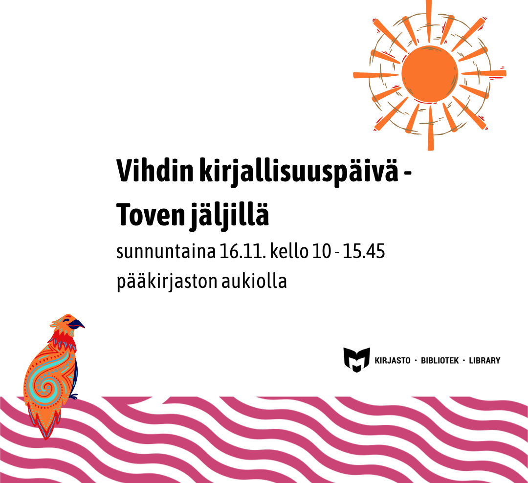 Päivän aikana syvennymme Tove Janssonin elämään ja teoksiin – puhumme muun muassa sarjakuvista, merestä ja Janssonin teosten filosofiasta Vihdin pääkirjaston aukiolla.