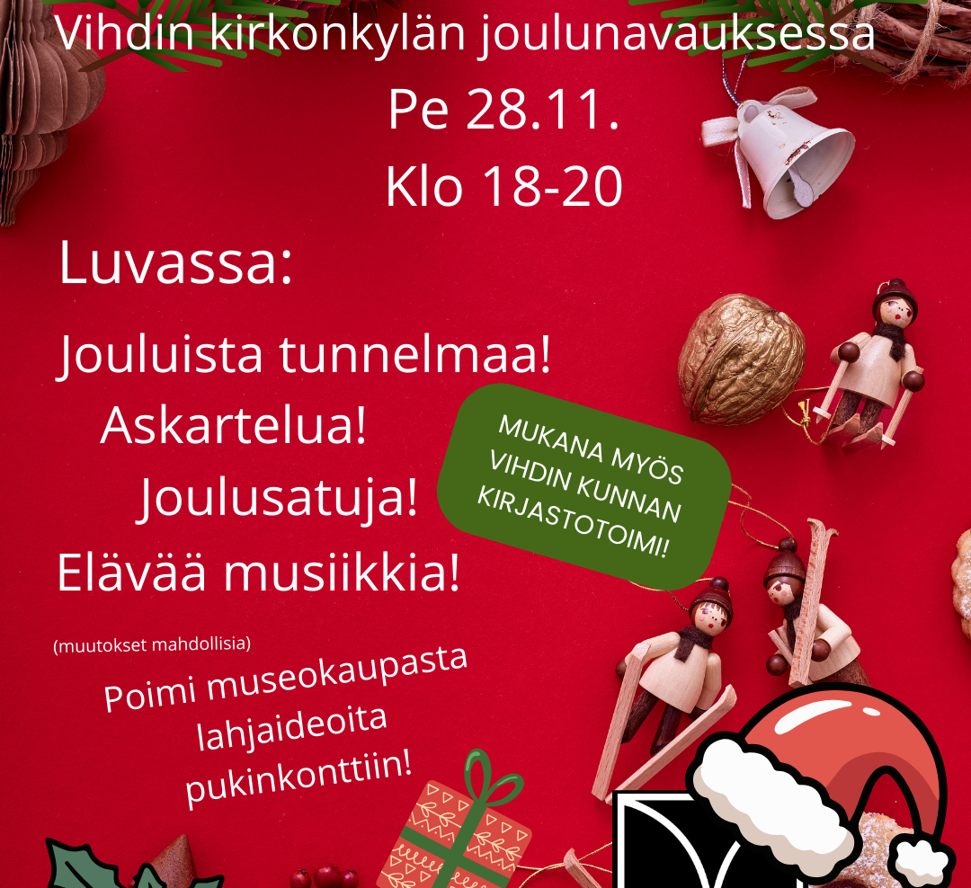 Vihdin museo on myös tänä vuonna mukana tapahtumassa. Museosta voi tulla hakemaan lisää joulumieltä vaikkapa jouluaskarteluiden parista sekä tekemään löytöjä pukinkonttiin museokaupasta. Tunnelmaa täydentävät elävä musiikki ja joulusadut. Saduista ja askarteluista vastaavat Vihdin kunnankirjaston tontut!