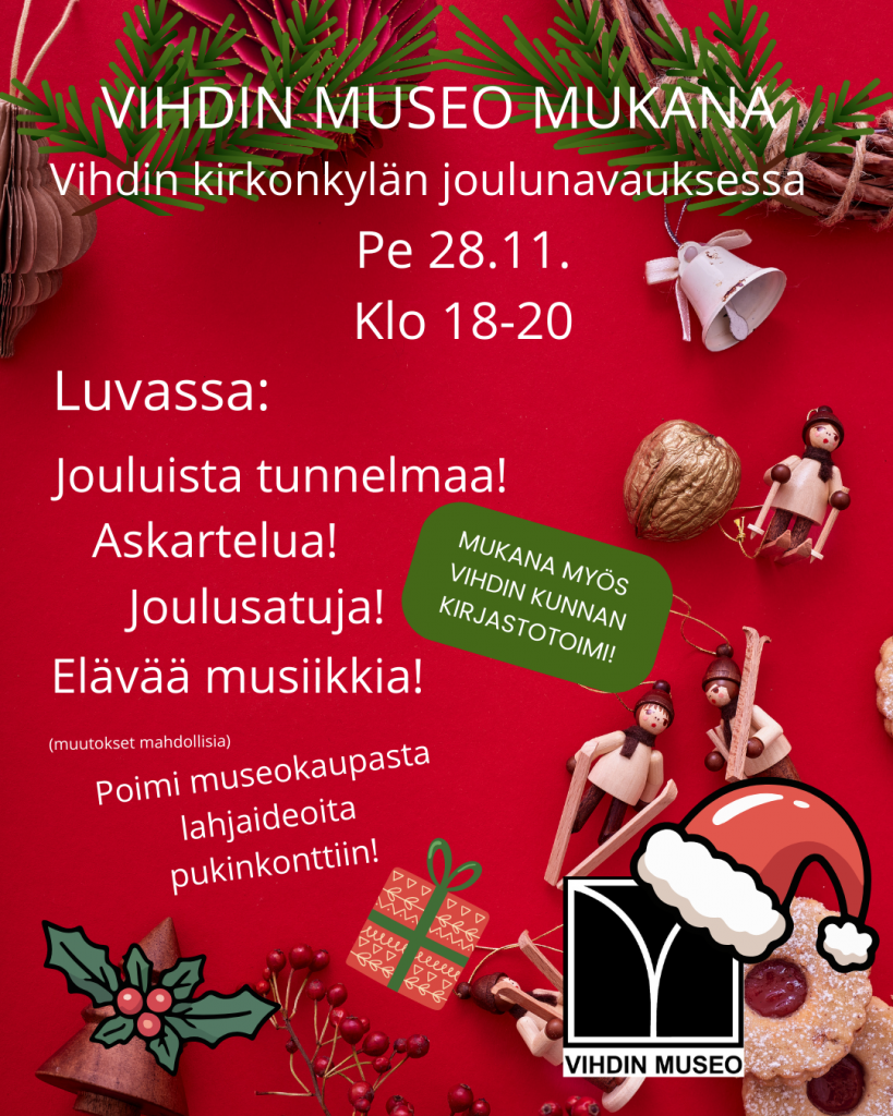 Kirjasto on mukana tapahtumassa Vihdin museolla klo 18-20, kirjaston tonttujen kanssa voi askarrella joulukuuseen palloja. Satutäti lukee jouluisia satuja.