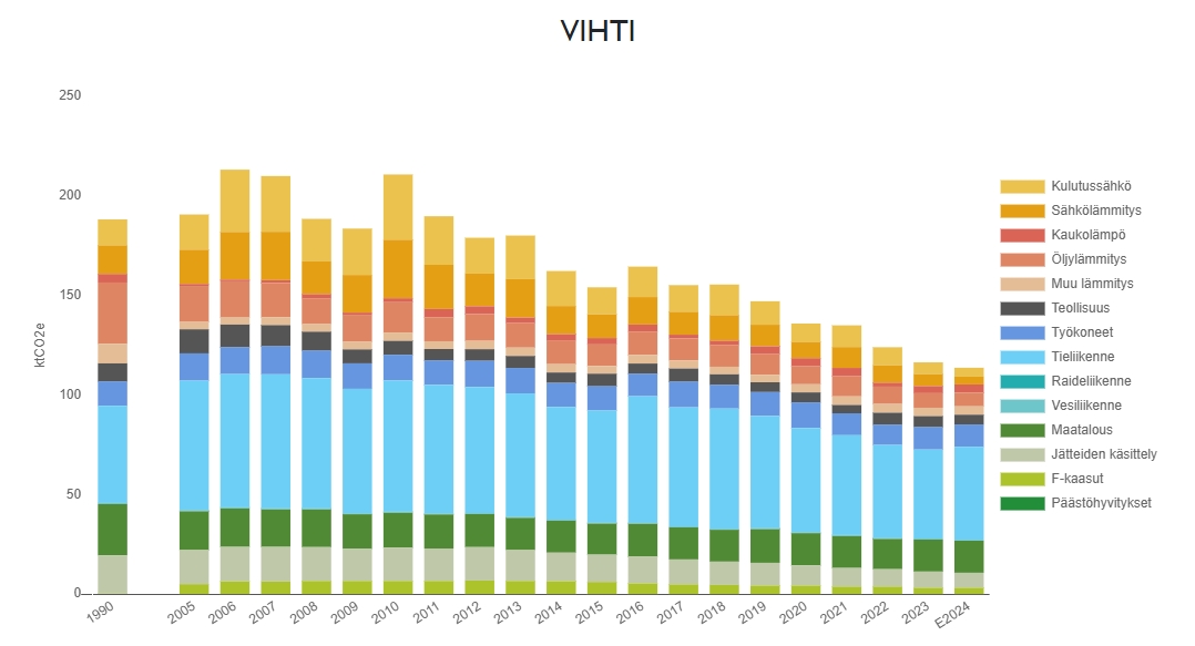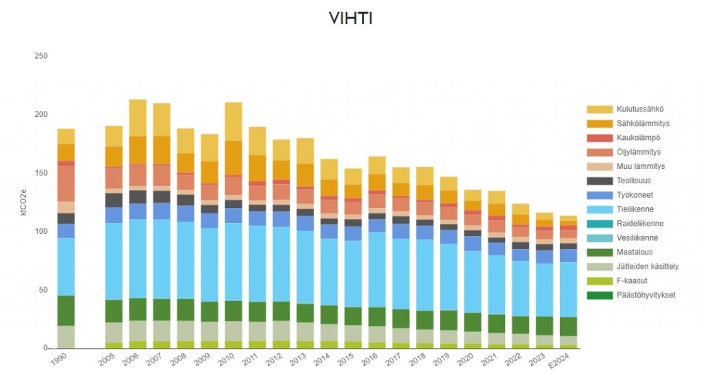 Ennakkotiedon perusteella Vihti on jo kuudetta vuotta peräkkäin onnistunut vähentämään kokonaispäästöjään, vuodesta 2018 lähtien! Vuoteen 2023 verrattuna, Vihdin kokonaispäästöt vuonna 2024 pienentyivät – 2 % ja vuoteen 1990 verrattuna kokonaispäästöt ovat pienentyneet -40 %.