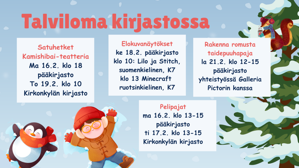 Talvilomalla kirjastossa järjestetään kamishibai-teatteria, elokuvanäytöksiä lapsille sekä erilaisia puuhapajoja. Lauantaina sukelletaan Rakenna romusta- taidepuuhapajaan yhteistyössä Galleria Pictorin kanssa.