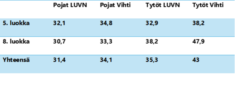 Länsi-Uudenmaan hyvinvointialueen keskiarvoon verrattuna Vihdin tulokset ovat heikommalla tasolla. Etenkin 8. luokan tyttöjen tulokset ovat lähes 10 prosenttiyksikköä huonommat verrattuna hyvinvointialueen keskiarvoon.