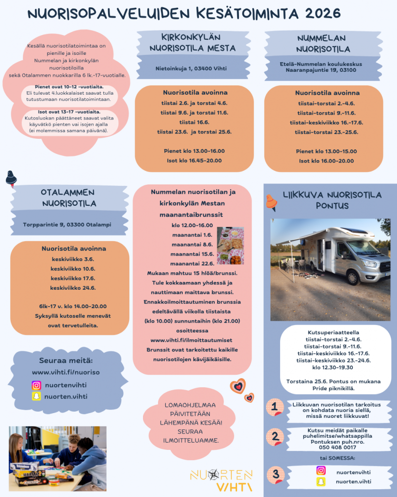 Kesällä nuorisotilatoimintaa on pienille ja isoille Nummelan ja kirkonkylän nuorisotiloillasekä Otalammen nuokkarilla 6 lk.-17-vuotialle.