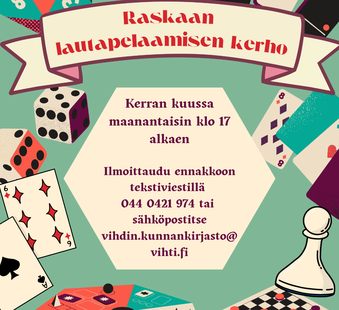 Raskaan lautapelaamisen kerho kokoontuu Vihdin pääkirjaston monitoimitilassa kuun ensimmäisenä maanantaina klo 17 alkaen. Voit ilmoittautua mukaan laittamalla tekstiviestiä numeroon 044 0421 974 tai sähköpostia vihdin.kunnankirjasto@vihti.fi.