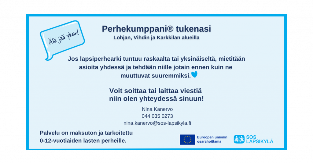 Perhekumppani tukee lapsiperheitä tilanteissa, kun arki tuntuu raskaalta tai yksinäiseltä. Perhekumppani auttaa perheitä ratkomaan asioita ja ohjaa tarvittaessa sopivan palvelun pariin oikea-aikaisesti. Palvelu on maksuton ja tarkoitettu 0-12-vuotiaiden lasten perheille. Voit ottaa yhteyttä Perhekumppani Ninaan puhelimitse tai viestillä: 044 035 0273, nina.kanervo@sos-lapsikyla.fi
